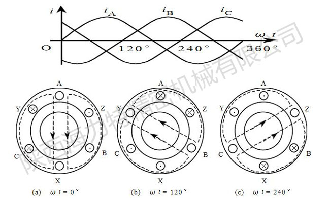 如下圖,就是最簡單的三相定子繞組AX、BY、CZ,它們在空 間按互差120度的規律對稱排列,并接成星型與三相電源U、V、W相聯,則三相定子繞組便通過三相對稱電流,當ωt=0時,iA=0,AX繞組中無電流;iB為負,BY繞組中的電流從Y流入B流 出;iC為正,CZ繞組中的電流從C流入Z流出;由右手螺旋定則可得合成磁場的方向如下圖所示,當t=1200時,iB=0,BY繞組中無電流;iA為正,AX繞組中的電流從A流入X流出;iC為負,CZ繞組中的電流從Z流入C流出;由右手螺旋定則可得合成磁場的方向如下圖所示。當t=2400時,iC=0,CZ繞組中無電流;iA為負,AX繞組中的電流從X流入A 流出;iB為正,BY繞組中的電流從B流入Y流出;由右手螺旋定則可得合成磁場的方向如下圖所示。可見,當定子繞組中的電流變化一個周期時,合成磁場也按電流的相序方向在空間旋轉一周。隨著定子繞組中的三相電流不斷地作周期性變化,產生的合成磁場也不斷地旋轉,因此稱為旋轉磁場。